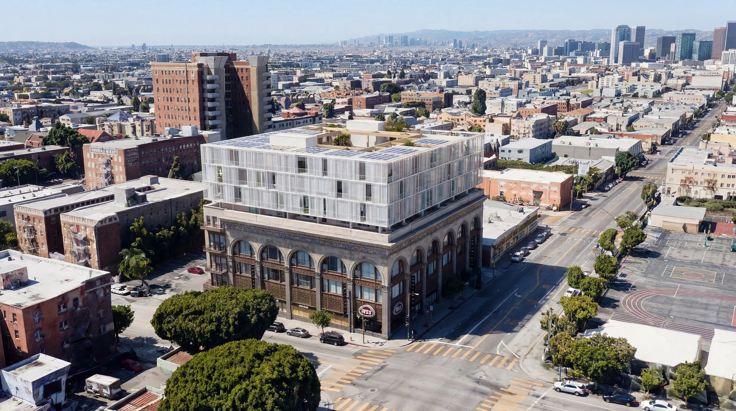 The building has been engineered to carry ten floors, but only four floors have been built. This is an opportunity to mindfully add density to the existing structure. The roof becomes the new building plot.